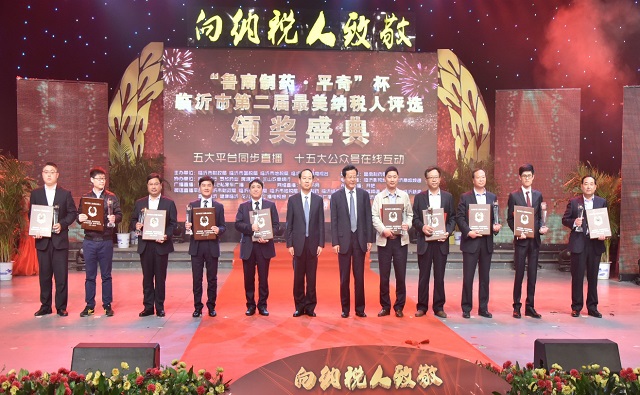 4月28日,臨沂市第二屆“最美納稅人”評(píng)選頒獎(jiǎng)盛典在臨沂市電視臺(tái)演播大廳舉行,臨沂市政協(xié)主席徐濤,市委常委、常務(wù)副市長(zhǎng)李沂明,市人大常委會(huì)副主任丁善余,市政協(xié)副主席李宗濤,市財(cái)政局、國(guó)稅局、地稅局等部門主要負(fù)責(zé)人出席典禮并為獲獎(jiǎng)企業(yè)頒獎(jiǎng),股份集團(tuán)公司副總經(jīng)理韓風(fēng)生作為公司代表上臺(tái)領(lǐng)獎(jiǎng)。