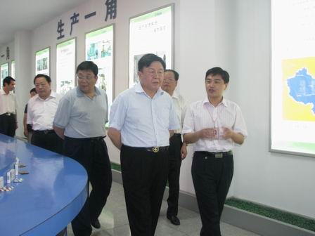 上圖為山東省政協副主席喬延春(前排右二)、臨沂市政協主席孟憲海(后排右一)、羅莊區區委書記王行華(后排左一)等領導參觀公司展廳時的情景