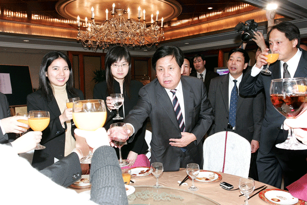 臨沂市副市長、羅莊區區委書記李峰在慶功會上共同舉杯祝賀羅欣藥業的成功上市