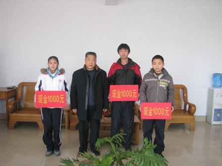 上圖為羅欣集團工會主席張祥軍代表羅欣集團向羅莊一中楊傳棟(左二)、陳麗泉(左一)、高亞南(左四)3名貧困生捐贈助學金時的情景