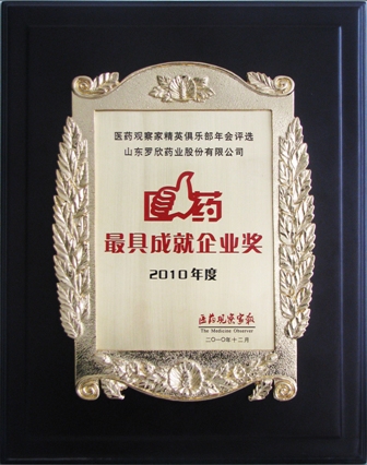 2010年12月8日,第64屆全國藥品交易會召開之際,醫藥觀察家報社在江西南昌召開了“十二五規劃•醫藥新格局高峰論壇暨《醫藥觀察家》精英俱樂部年會”。會上評選了十大醫藥精英獎、最具投資價值企業獎、最具市場潛力新品獎和最具成就企業獎四大獎項,我公司榮獲最具成就企業獎,中國醫藥企業管理協會、中國醫藥企業家協會會長、北京醫藥集團公司名譽董事長、醫藥經濟報首席專家、國家發展改革委員會生物醫藥專家委員會副主任、國家科技部國家重大專項專家委員會專家于明德給獲獎單位頒發了獎牌和證書。
