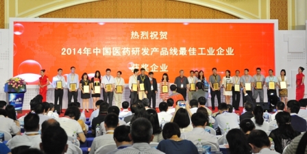 上圖為2014年中國醫(yī)藥研發(fā)產(chǎn)品線最佳工業(yè)企業(yè)頒獎(jiǎng)現(xiàn)場
