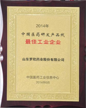 上圖為“2014年中國醫(yī)藥研發(fā)產(chǎn)品線最佳工業(yè)企業(yè)”榮譽(yù)證書