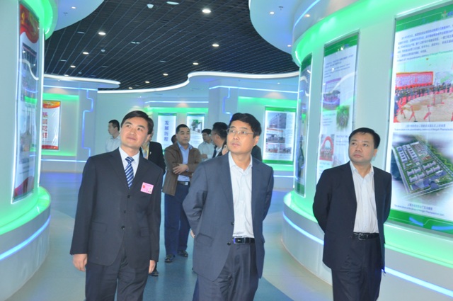 上圖為省食品藥品監(jiān)管局藥品生產(chǎn)監(jiān)管處處長劉玉東(右二)蒞臨公司展廳參觀考察