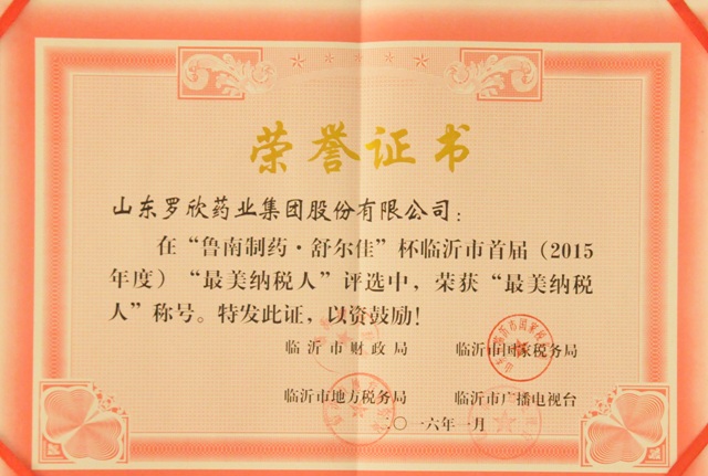 羅欣藥業堅持“回報社會”的價值觀,自覺承擔社會責任,向全社會展示了新時代納稅人誠信納稅、回饋社會的良好形象。羅欣藥業將繼續堅持“回報員工”,“回報客戶”,“回報股東”,“回報社會”,“固強企業”的價值觀,以“羅欣藥業,傳遞健康”的企業理念,為國家貢獻更多的稅金,積極參與社會扶弱濟貧,為社會安置就業機會,為廣大患者治療和康復提供更多、更好的高科技藥品,為發展醫藥事業,振興臨沂經濟做出更大的貢獻。